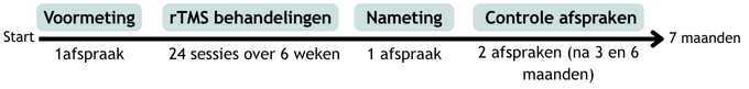 Doet u mee met het onderzoek? Dan duurt dat in totaal ongeveer zeven maanden. In deze periode komt u maximaal 28 keer naar het Amsterdam UMC, locatie VUmc: voor een gesprek en metingen om te kijken of u mee kunt doen, 24 keer voor de behandeling, een meting na de behandeling, en tot slot voor twee controleafspraken na 3 en 6 maanden.