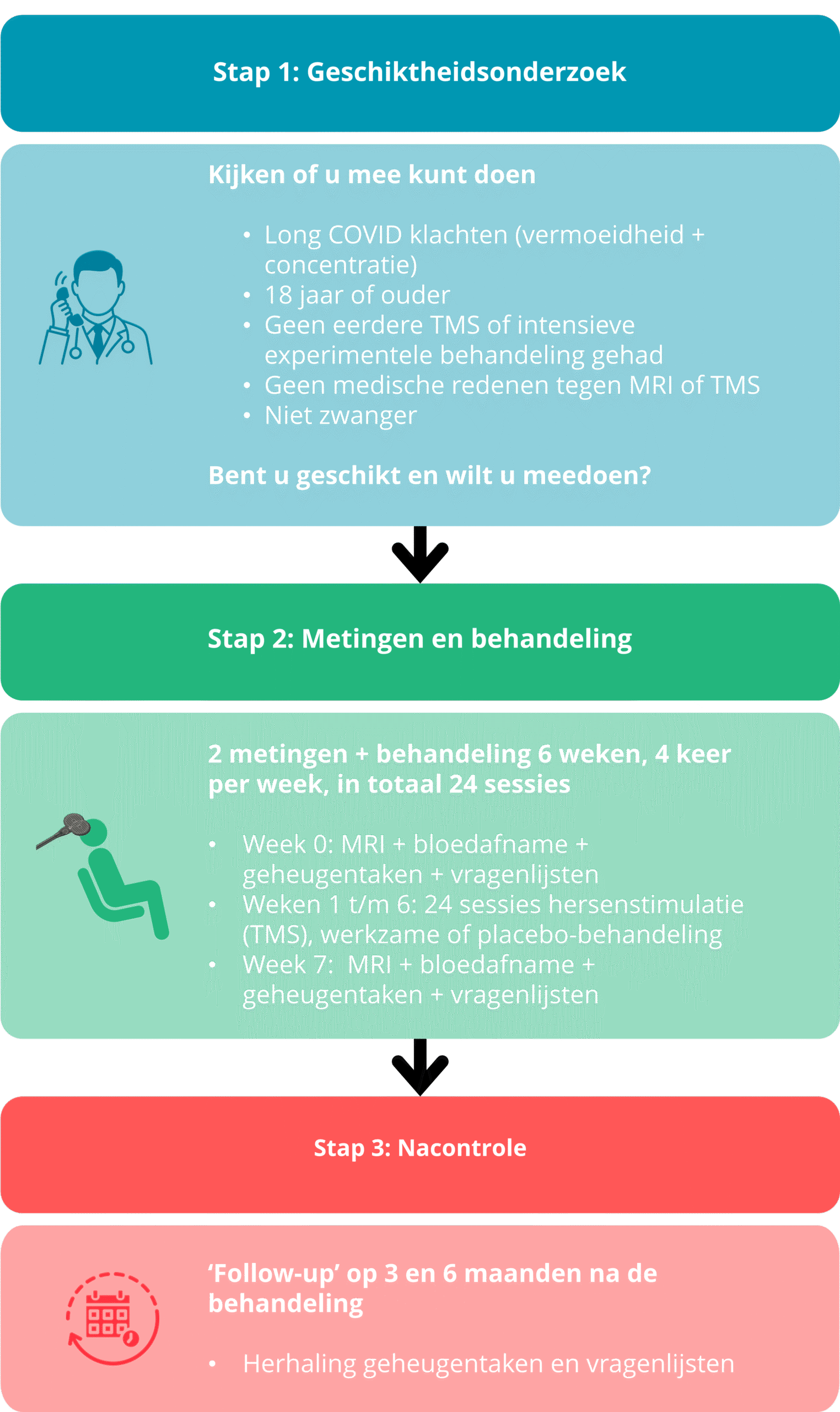 In onderstaande afbeelding ziet u het verloop van het onderzoek. Een uitgebreidere beschrijving van het onderzoek staat in de informatiebrief. Die kunt u opvragen via de e-mail.